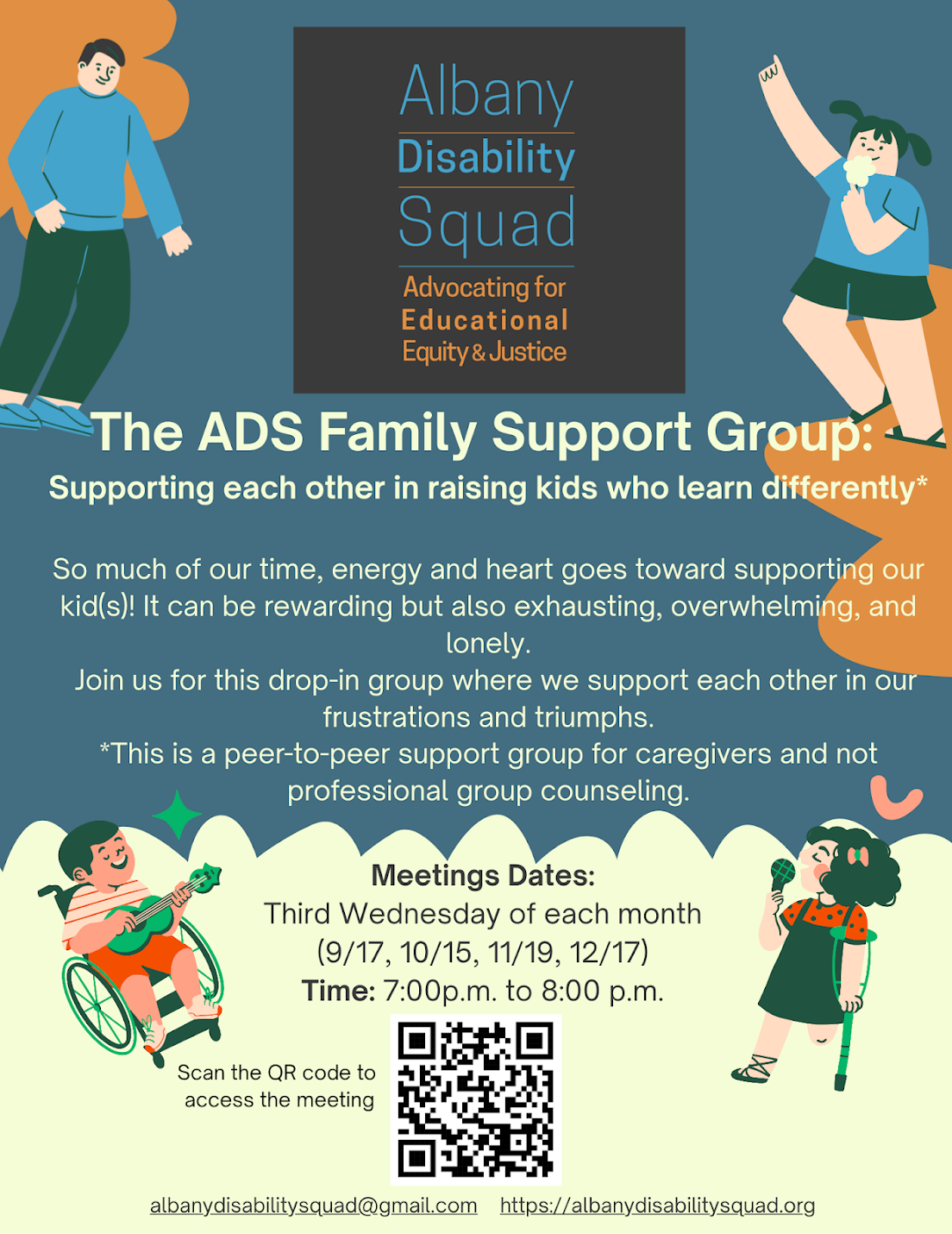 Please join us for the next meeting of the Albany Disability Squad's Family Support Group* Wednesday, January 21, 7–8 pm and the third Wednesday of upcoming months. So much of our time, energy and heart goes toward supporting our kid(s)! It can be rewarding but also exhausting, overwhelming, and lonely. This drop-in group provides peer support to each other in our frustrations and triumphs. Join the Zoom Meeting at this link or dial by your location: (408) 638-0968, Meeting ID: 886 0018 4968, Passcode: 798604. *This is a peer-to-peer support group for caregivers and not professional group counseling.