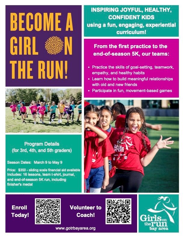 Girls on the Run Bay Area is dedicated to empowering young girls through running, mentorship, and our nationally recognized confidence-building curriculum. We're gearing up for our Spring 2026 program! See flyer for information about participant and coach registration.