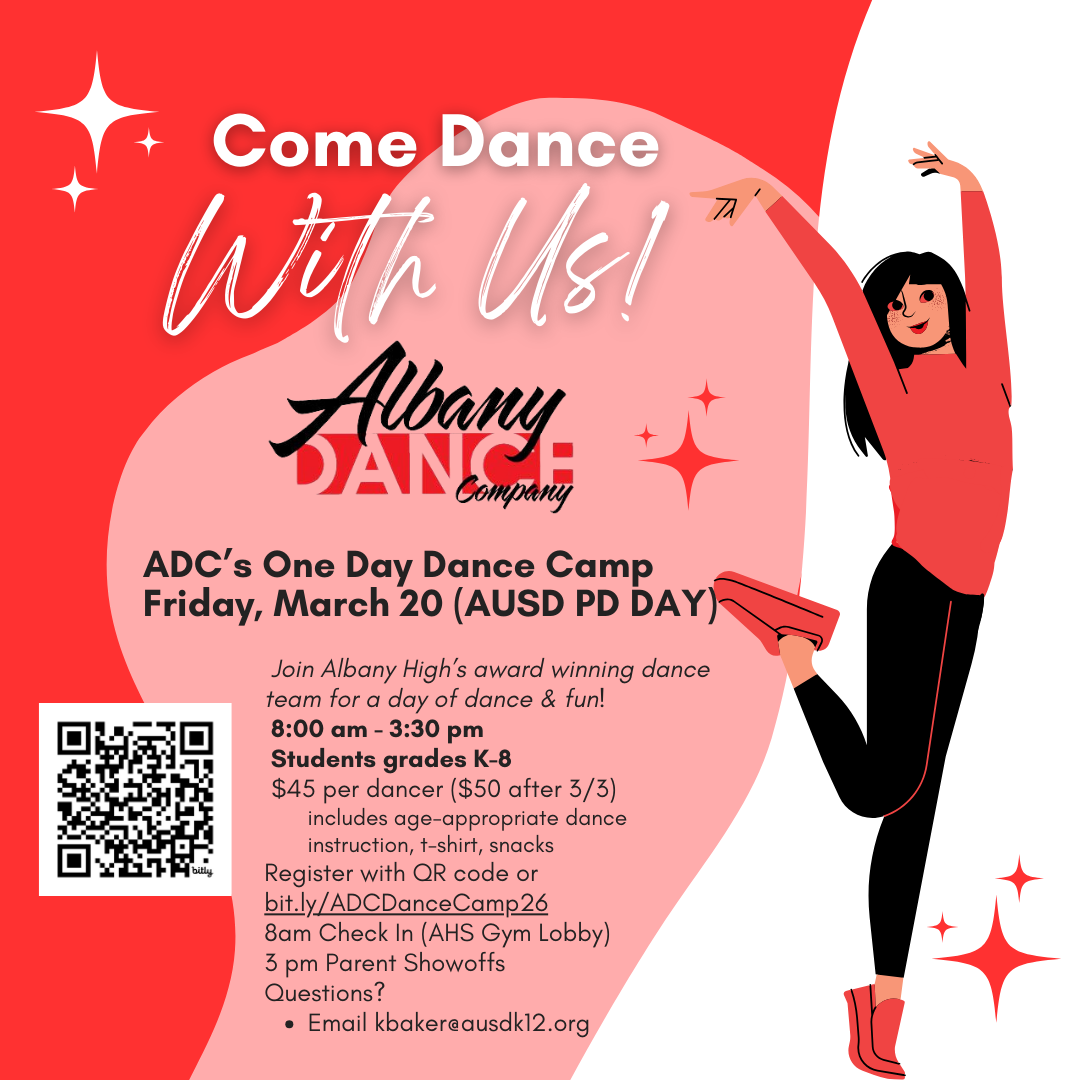 Albany Dance Company (ADC), Albany High’s dance group, will be once again hosting a one-day dance camp for students in grades K–8 on March 20, 8am–3:30pm, Albany Unified’s staff professional development day—a no-school day for students! We hope this event will help out AUSD families by providing a day of fun activities for their students while also introducing them to our dance program at Albany High. Cost is $45 per dancer, $50 after March 3. Register with the QR code above in the flyer or at http://bit.ly/ADCDanceCamp26.
