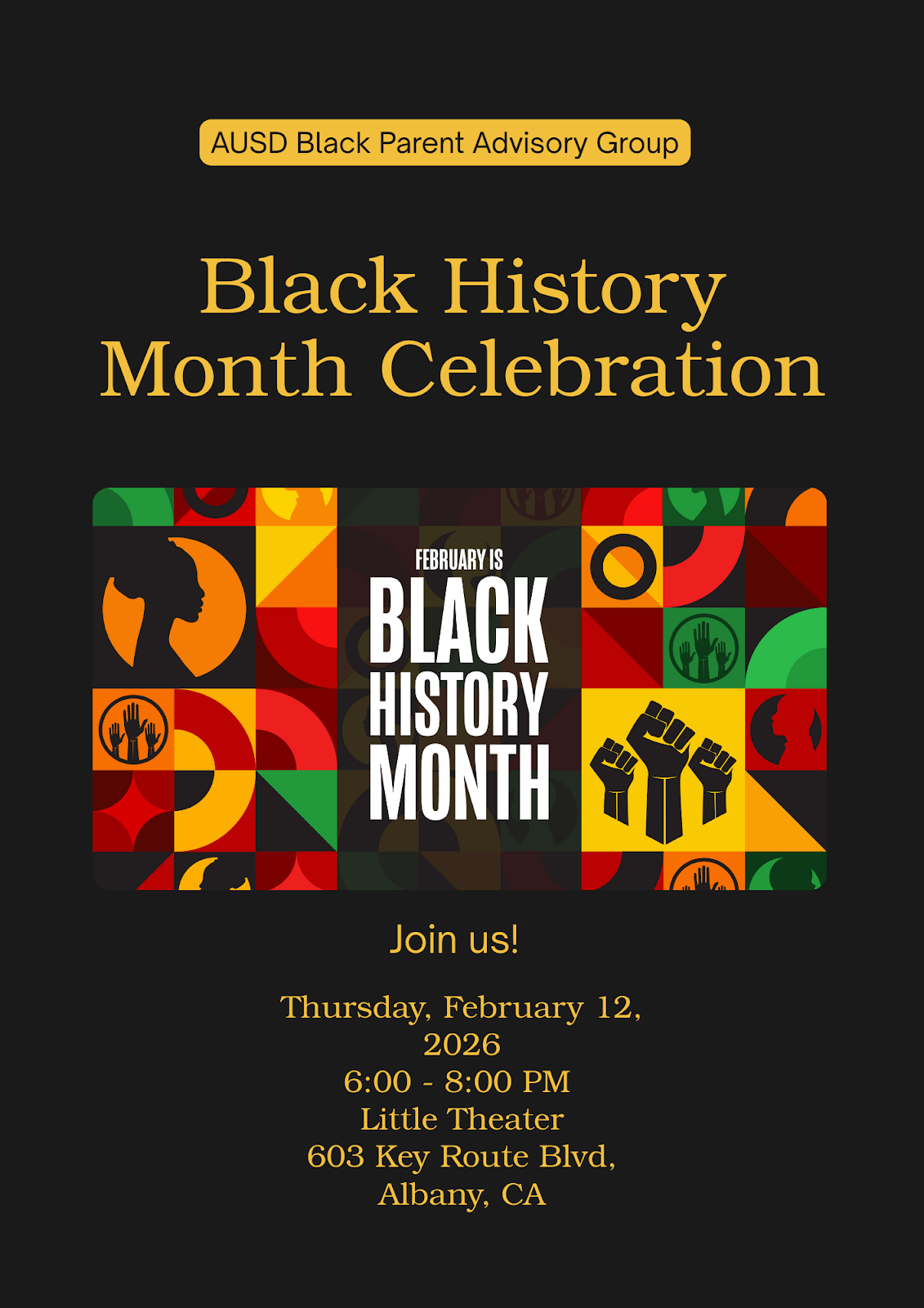 | Feb 12 | Black History Month Celebration, 6-8pm, AHS Little Theater |