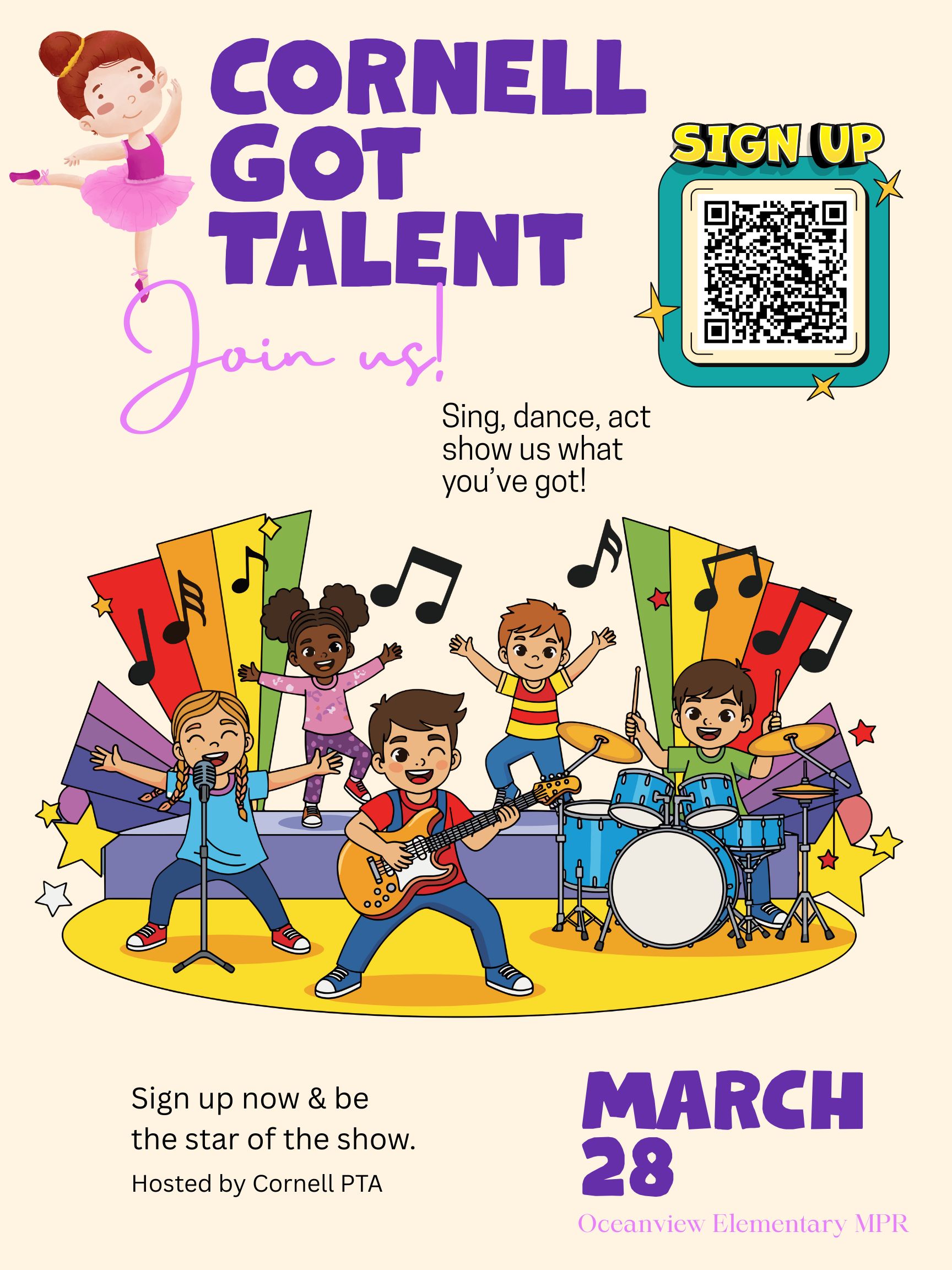 - Dress Rehearsal: March 14, Oceanview Elementary MPR (time TBD)