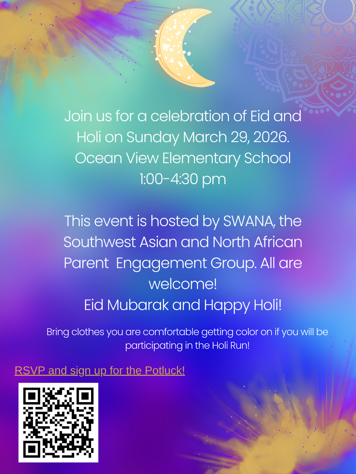 Join the Celebration of Eid and Holi on Sunday, March 29, 1:00pm-4:30pm at Ocean View Elementary School. This event is hosted by SWANA, the Southwest Asian and North African Parent Engagement Group. All are welcome to attend! Scan the QR code above to RSVP and sign up for the Potluck.