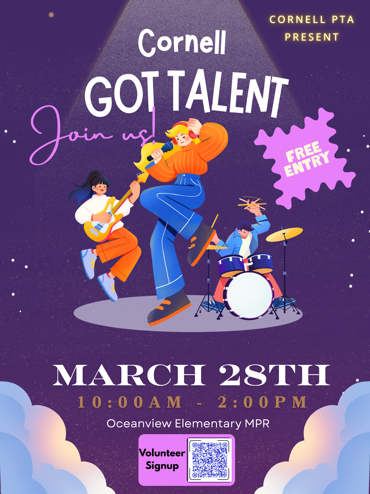 We’re looking for volunteers to help make this year’s Cornell's Got Talent Show, on Saturday, March 28th, a fun and successful event for our students and families! If you are able to help, please take a moment to review the available roles and sign up for a time slot that works for you in the Google Sheet. Thank you!!!